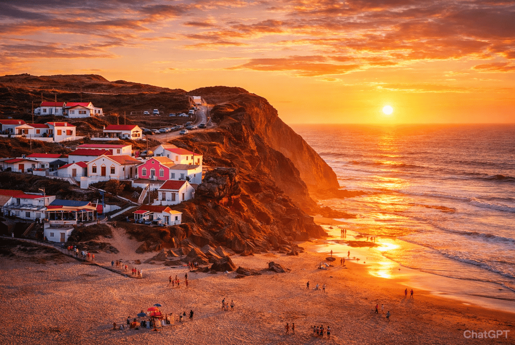 The cliffs above Arrifana are iconic. At golden hour, the Atlantic glows copper and red.